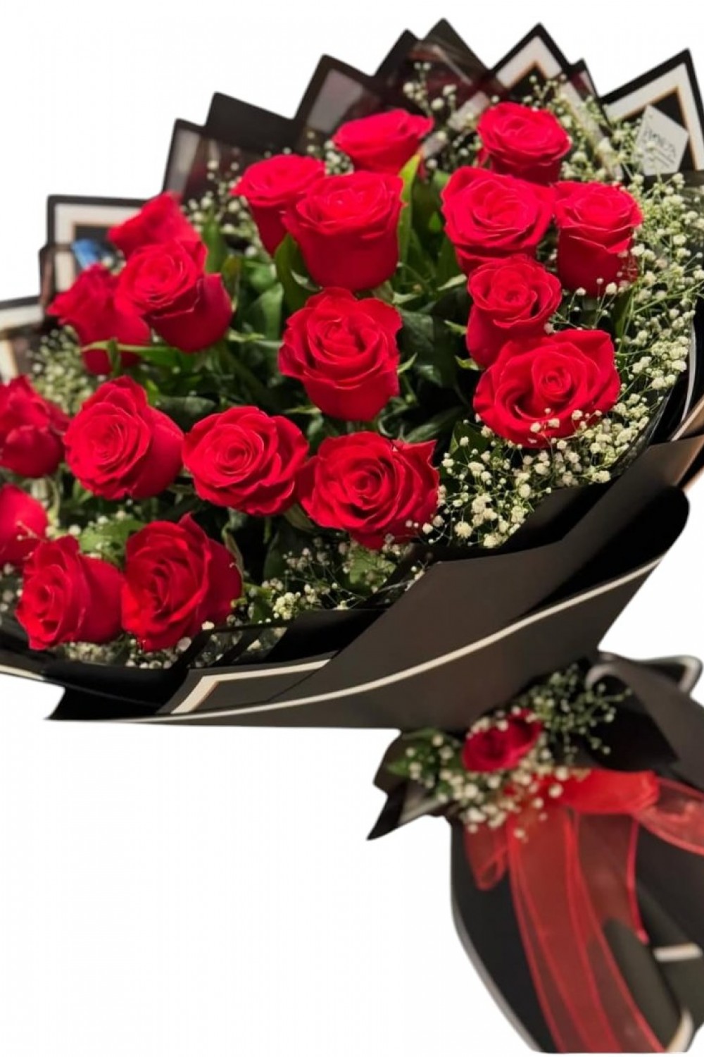Taptaze, canlı kırmızı güller; beyaz cipso çiçekleriyle süslenerek şık siyah ambalaj içinde özenle hazırlanır. Kırmızı kurdelesiyle tamamlanan bu buket, hem klasik hem modern bir şıklık sunar.