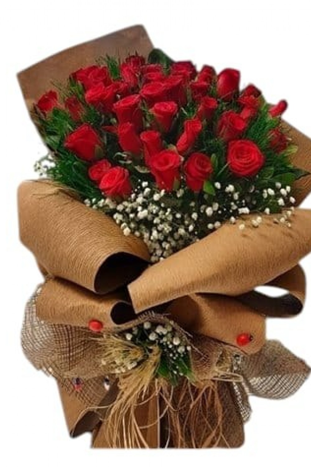 Doğal kahverengi kraft kâğıt ambalajı, kırmızı güllerin canlı tonunu ön plana çıkarır. Beyaz cipso çiçekleri ve yeşil yapraklarla tamamlanan bu zarif tasarım, rustik ve sıcak bir görünüm sunar.