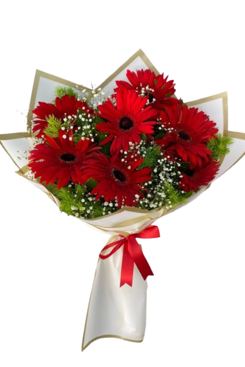 Taptaze kırmızı gerberalar, beyaz cipso çiçekleri ve canlı yeşilliklerle bir araya gelerek romantik ve zarif bir görünüm oluşturur.