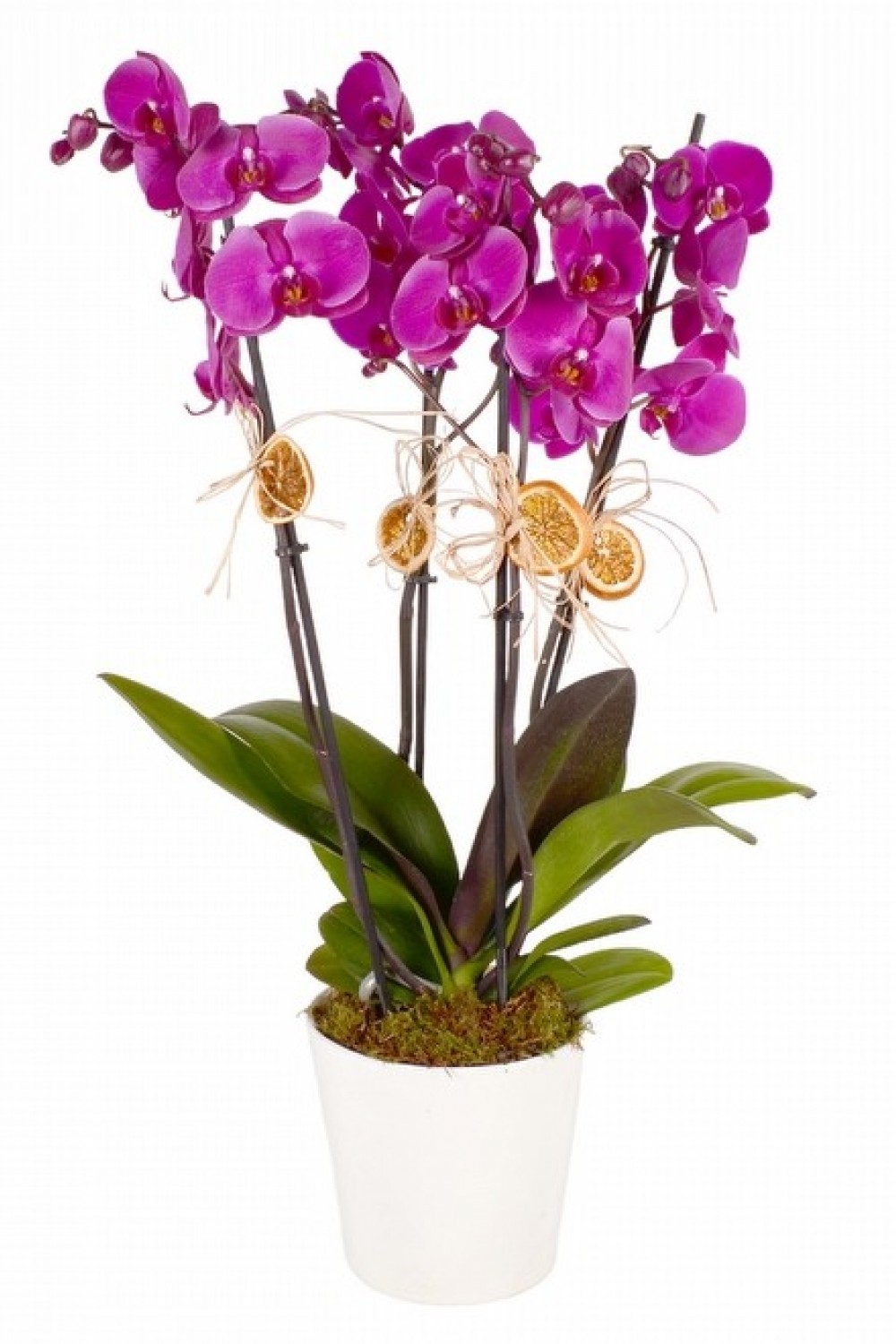 Güçlü ve şık tasarımı ile Saksıda 4 Mor Orkide, birbirinden taze ve canlı orkidelerden oluşur. Çiçeğin yaklaşık yüksekliği 50 - 60 cm boyutlarındadır.