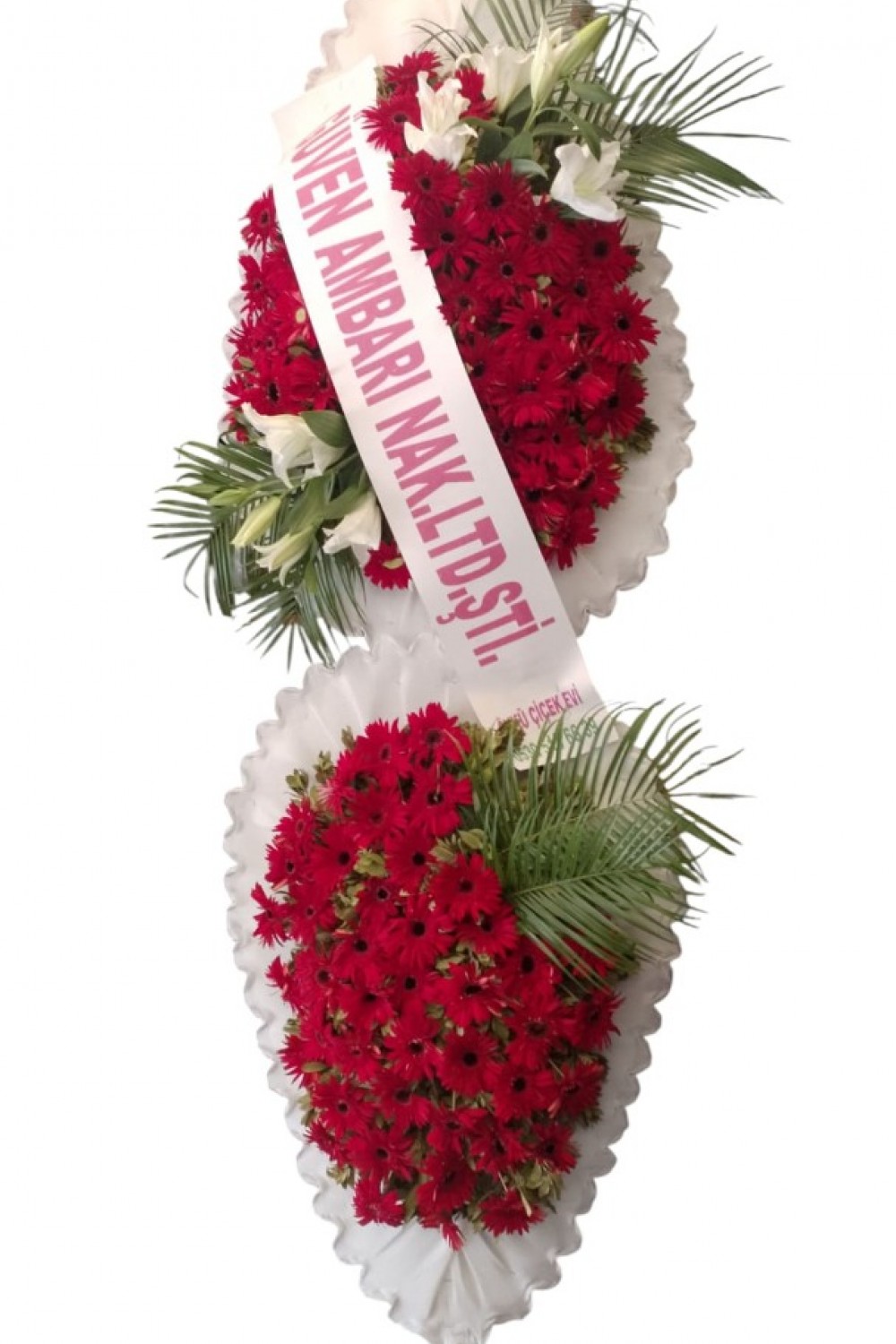 Öykü Çiçek Evi’nin özenle hazırladığı bu zarif çelenk, canlı kırmızı gerberalar ve beyaz lilyum detaylarıyla özel günlerinize anlam katar.